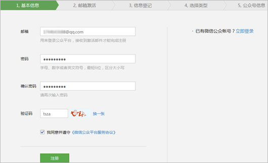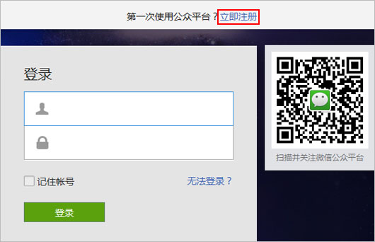 通过电脑登录微信公众平台官网:http://mp.weixin.qq.com/,点击右上角的“立即注册”。