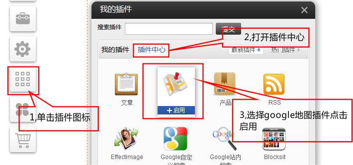 1、从左侧的工具栏,单击插件图标,打开插件中心选中Google地图插件点击启用。
