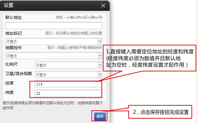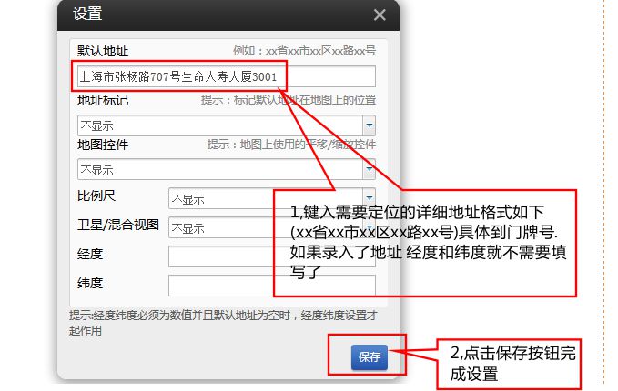 (用此方法需要注意:经度纬度必须为数值并且默认地址为空时,经度纬度设置才起作用)