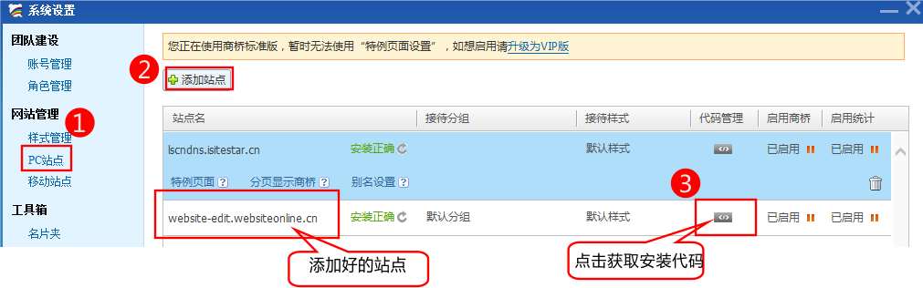 3, 登陆百度商桥后依次点击 Pc站点-》添加站点-》复制代码