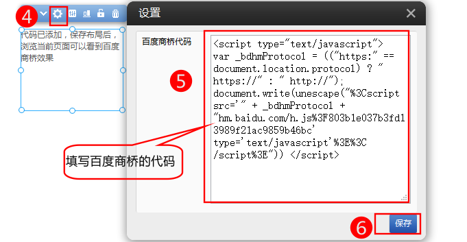 2,在百度商桥模块上方点击设置-》填写百度商桥代码-》保存