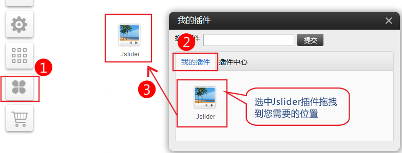1.依次点击 插件-我的插件-选中Jsilder插件,把插件拖拽到您需要的位置