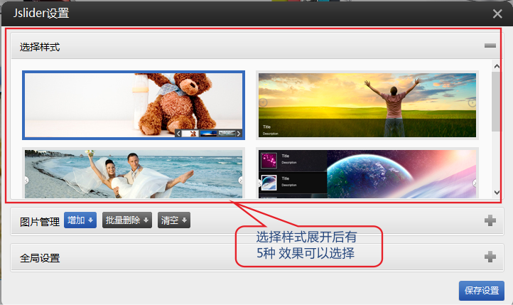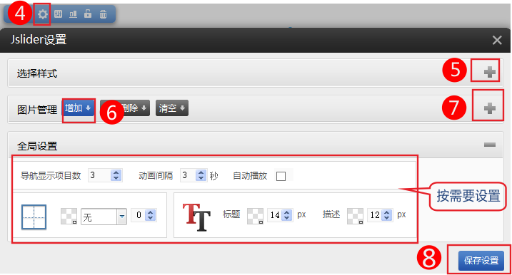 2.点击设置-》选择需要的样式-》增加图片-》根据需要配置 全局设置-保存。