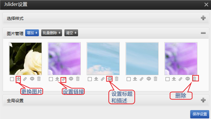 2-2 Jslider 在图片管理中可以更换图片并设置超链接、标题、描述。
