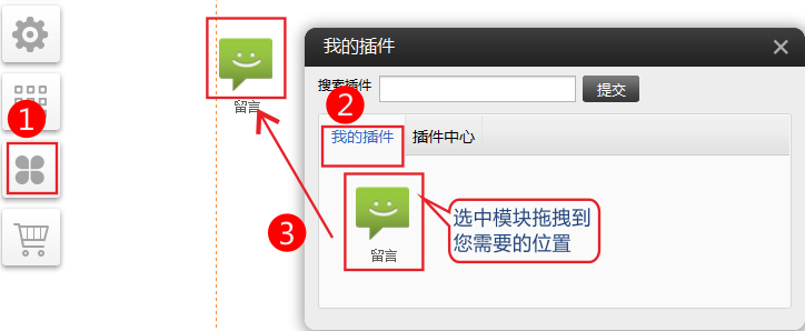 如果插件没有在“我的插件”中,请先到“插件中心”將插件启用。启用后在“我的插件”中,把插件拖到页面中应用。