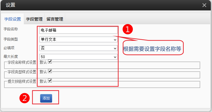 3、 系统默认只有两项留言项目:标题以及题目,如果希望访客给您留言时填写更多或更少信息,可通过“设置”添加或者删除字段。