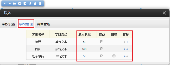 4、 点击“字段管理”,可以对字段进行修改,删除或者调整顺序: