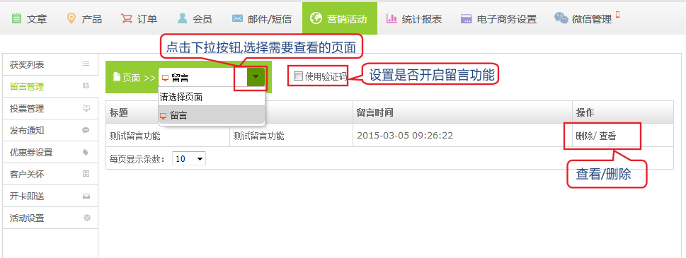 5、 点留言管理,可以查看和管理访客的留言