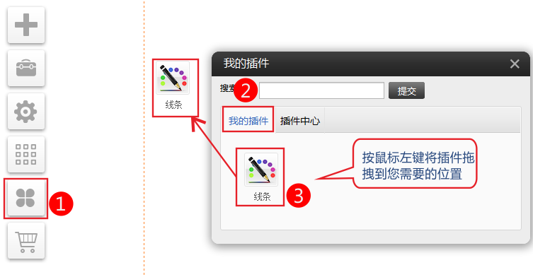 1、依次点击插件-我的插件-选中“线条”插件拖拽到您需要的位置。(如果“我的插件”中没有,请到插件中心选启用)