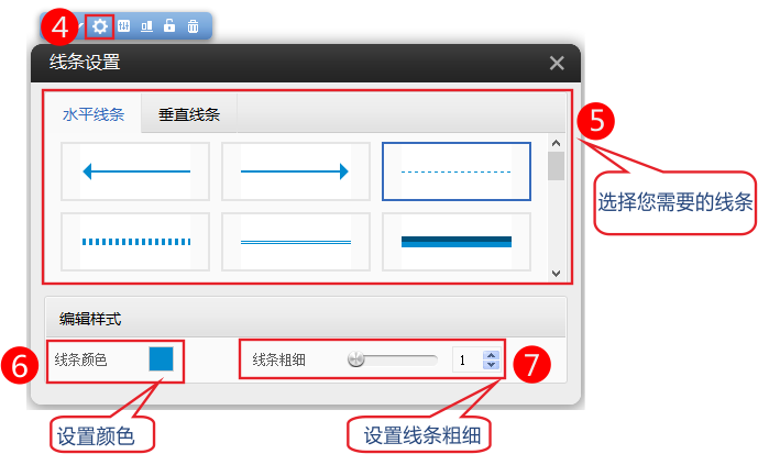a 系统提供多种线条样式可供选择,支持横向和竖向线条 b 所有线条样式支持客户自定义线条粗细 c 部分线条样式支持客户自定义线条颜色