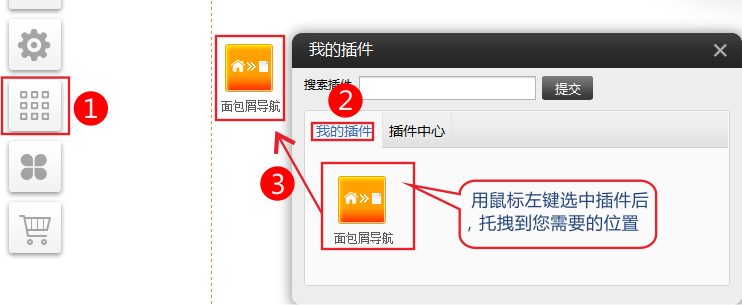 如果插件没有在“我的插件”中,请先到“插件中心”將插件启用。启用后在“我的插件”中,把插件拖到页面中应用。