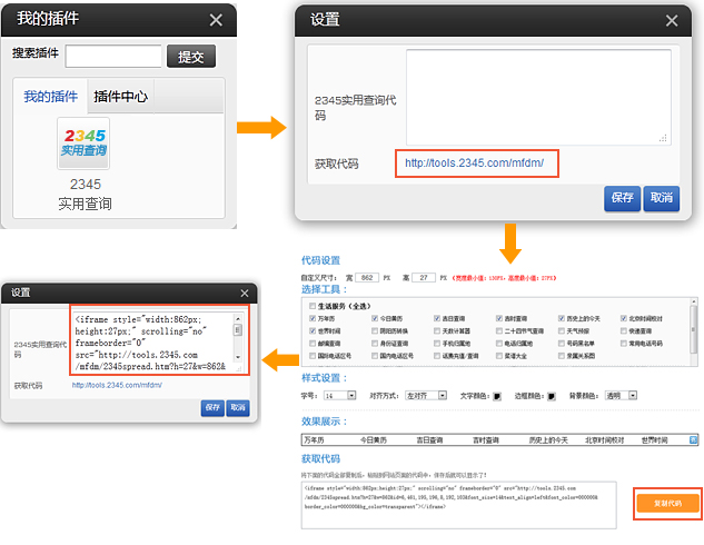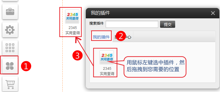使用方法:进入网站编辑-〉点左侧插件图标-〉插件中心,找到2345实用查询插件图标,点启用 可以为您的网站提供快捷实用查询 500余款实用工具供您使用,仅需要复制粘贴代码而已 如下图